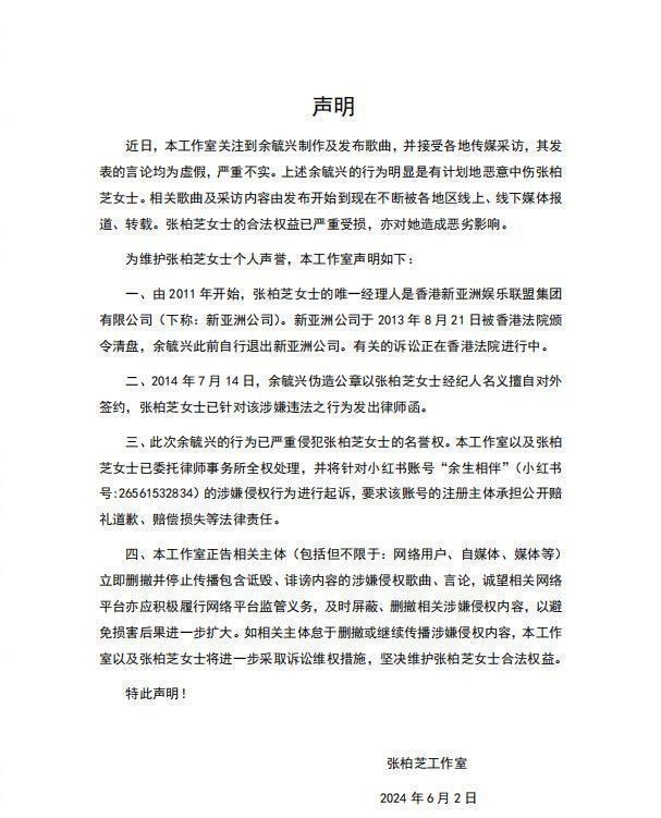 这件事其实早就有了预兆,2014年张柏芝方面已经发出律师函,指出余毓兴伪造公章,擅自用她的名义签订合同,到2020年,张柏芝工作室公开反驳了余毓兴说她“自认是狗”的说法,今年6月,余毓兴又发布了一首歌《以犬之名》,歌词和宣传中再次提到此事,引起网络上的广泛批评,张柏芝这边也打算起诉他诽谤,只是目前还没有看到具体进展。